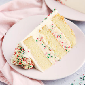 This Christmas sugar cookie dough cake features layers of my favorite extra-soft vanilla cake, vanilla buttercream, and edible sugar cookie dough placed between each cake layer. The sugar cookie dough is studded with Christmas-colored jimmy sprinkles for an extra festive touch and all of the textures together are just stunning. Definitely indulgent but in the best way!